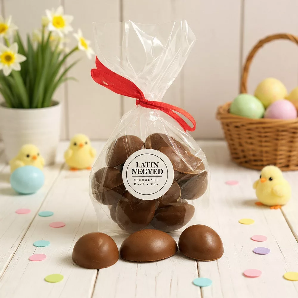 A csomag 100 g tejcsokoládé húsvéti féltojást tartalmaz. Egy tasakban 16–17 darab féltojás található, egyenként kb. 6 g-os méretben. Ez a mennyiség ideális: elég sok ahhoz, hogy tojáskereséshez is használjátok, ugyanakkor könnyen adagolható, így a vendégeknek és a locsolóknak is egyszerűen kínálható.