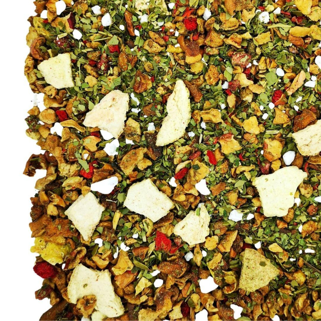 Összetevők: Almadarabok, brazil Mate (30%) savanyított almadarabok ( alma, savanyítószer: citromsav) ízesítő, fagyasztva szárított citromgranulátum, (citrom, maltodextrin), citrom, természetes citromolaj, fagyasztva szárított citromhéj, gránátalma magok, fagyasztva szállított gránátalma virágok.