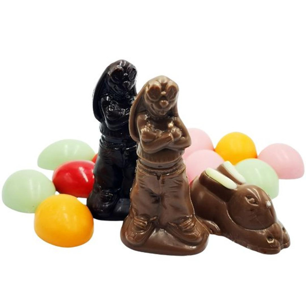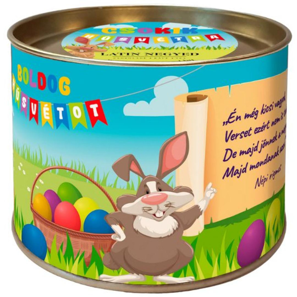 Kedves kis locsoló versikével is kiegészítettük ezt a szép díszdobozt. Tartalma a legédesszájúbbaknak is tökéletes választás. Két vagány rapper nyúl mellett találsz a dobozban epres, narancsos és lime ízesítésű tojásokat is. Persze a hagyományos pirostojás sem hiányzik mellőlük. A ráadás pedig egy roppanós, mogyorókrémmel töltött tapsifüles.