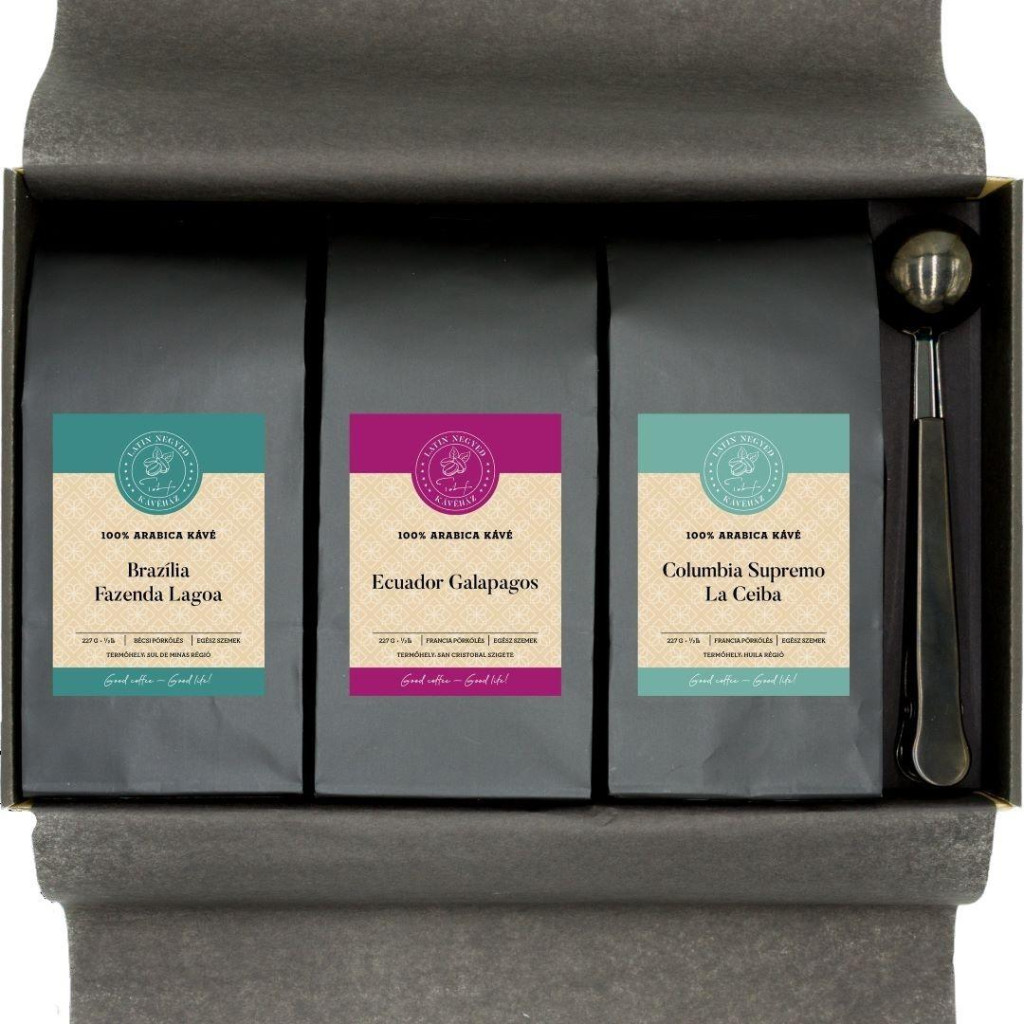 Dél-Amerika talán a bolygó legsikeresebben kávét termelő földrésze. A természeti adottságok, a magas hegyek, az időjárás, mind olyan tényezők, amelyek ezt a vidéket a világ leghíresebb termőhelyei közé emelik. Bátran választhatod ezt a csomagot, igazi különlegességeket fogsz kóstolni, amelyek jó keresztmetszetét adják a dél-amerikai kávéknak. A díszdobozban találsz egy praktikus összefoglalót a világ kávéfőzési szokásairól és eszközeiről is, amely segít a  hozzád legjobban illő elkészítési mód kiválasztásában. A csipeszes kávéadagoló kanálka pedig hasznos kis kiegészítő lesz a kávézási kellékeid között.