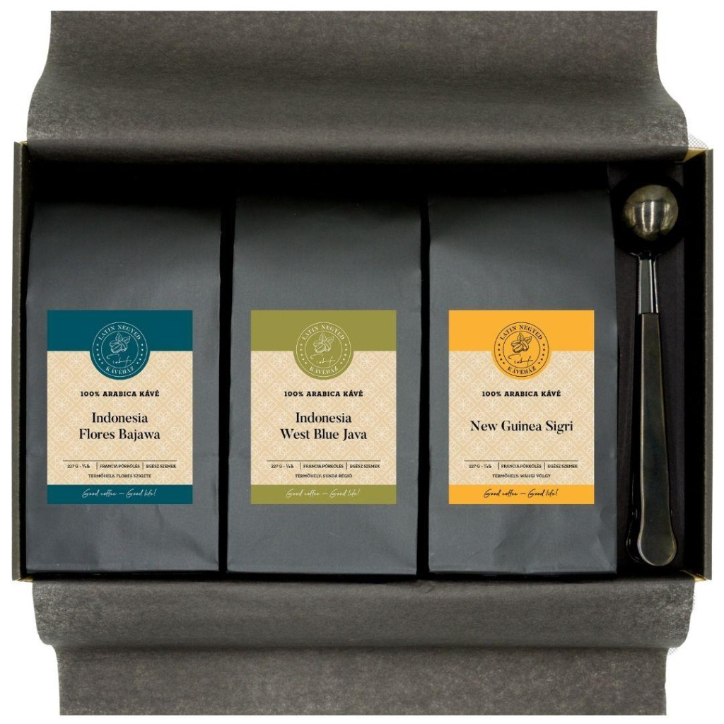 Délkelet-Ázsia a föld egyik legváltozatosabb vidéke. Ez meglátszik az itt termesztett kávékon is, mert az ízek és fajták teljes kavalkádja megtalálható ebben a régióban. Ennek ellenére vagy talán éppen ezért, a világ legkiválóbb kávéinak egy jelentős része itt terem. A díszdobozban találsz egy praktikus összefoglalót a világ kávéfőzési szokásairól és eszközeiről is, amely segít a  hozzád legjobban illő elkészítési mód kiválasztásában. A csipeszes kávéadagoló kanálka pedig hasznos kis kiegészítő lesz a kávézási kellékeid között.