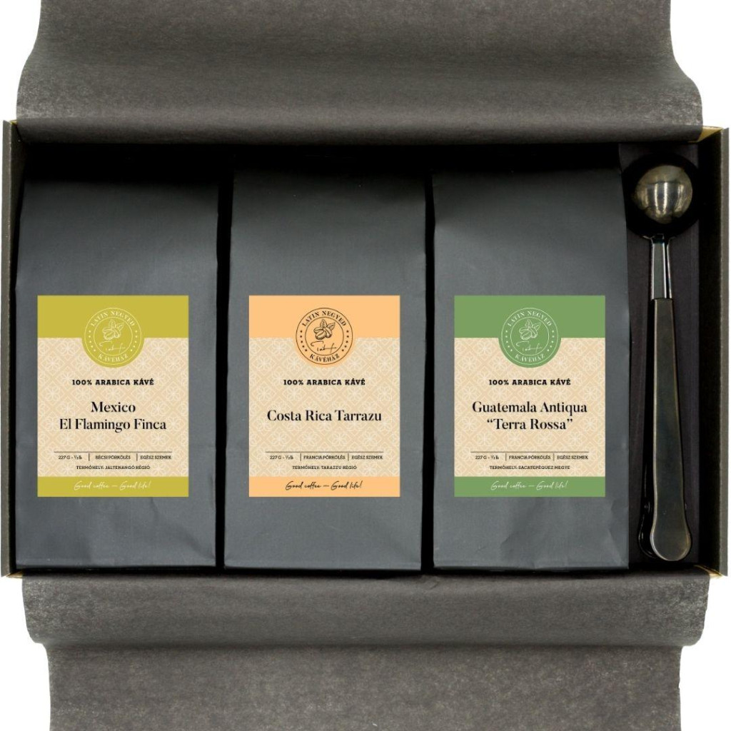 A Hispán csomagban található kávékat sok dolog köti össze a spanyol ajkú termelőkön kívül is. Ezek a kávék még zömében a régi kézműves módszerekkel, napon szárítva készülnek. Közös jellemzőjük a világosabb pörkölés és az ennek köszönhető gyümölcsös-virágos íz. Koffeintartalmuk alacsony, naponta többször is nyugodtan fogyaszthatod. A díszdobozban találsz egy praktikus összefoglalót a világ kávéfőzési szokásairól és eszközeiről is, amely segít a  hozzád legjobban illő elkészítési mód kiválasztásában. A csipeszes kávéadagoló kanálka pedig hasznos kis kiegészítő lesz a kávézási kellékeid között.