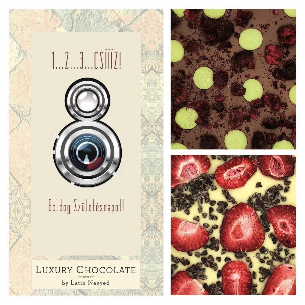 A születésnap mindig kiemelt ünnep. Lepd meg az ünnepeltet egy egyedi csokoládéval. Kiváló minőségű belga ét és tejcsokoládé varázslatos meggyel, eperrel és kakaóbabbal.
