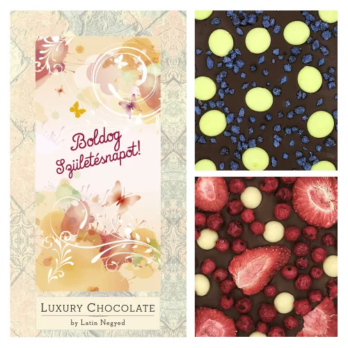 A születésnap mindig kiemelt ünnep. Lepd meg az ünnepeltet egy egyedi csokoládéval. Kiváló minőségű belga ét és tejcsokoládé varázslatos ibolyával, ribizlivel és eperrel.