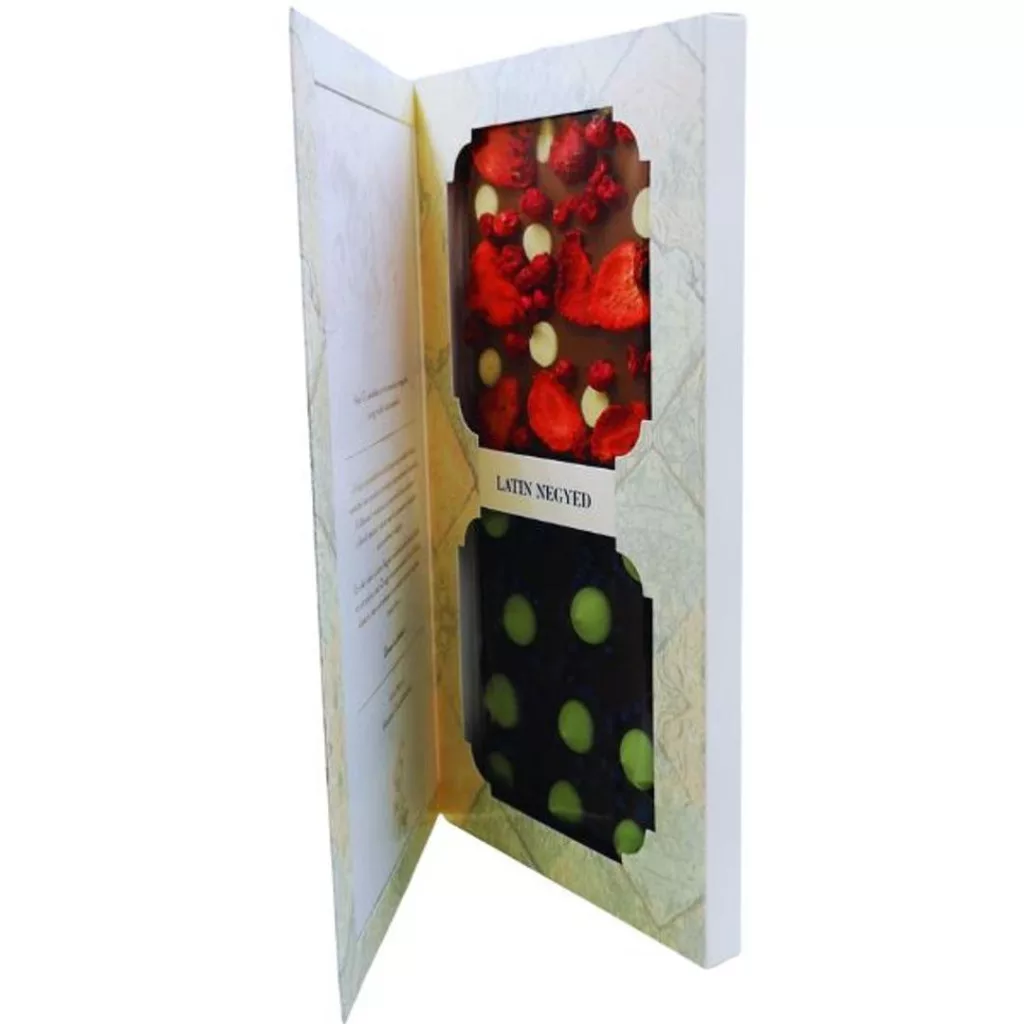 1. tábla: Étcsokoládé kandírozott ibolya és lime ízű csokoládé csepp szórattal 65g