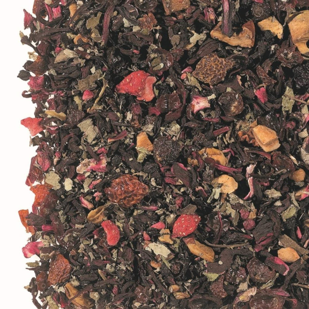 Hibiszkuszvirág, csipkebogyóhéj, almadarabok, bodza, feketeszeder, természetazonos aroma, eper és málna.