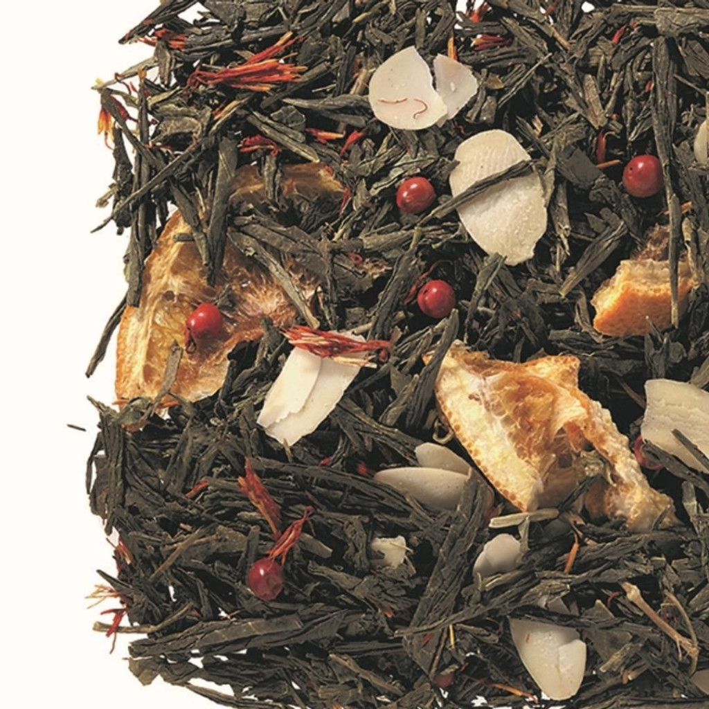 Zöld tea, narancs darabok, mandula, sáfrányos szeklice, rózsabors, természetes aroma.