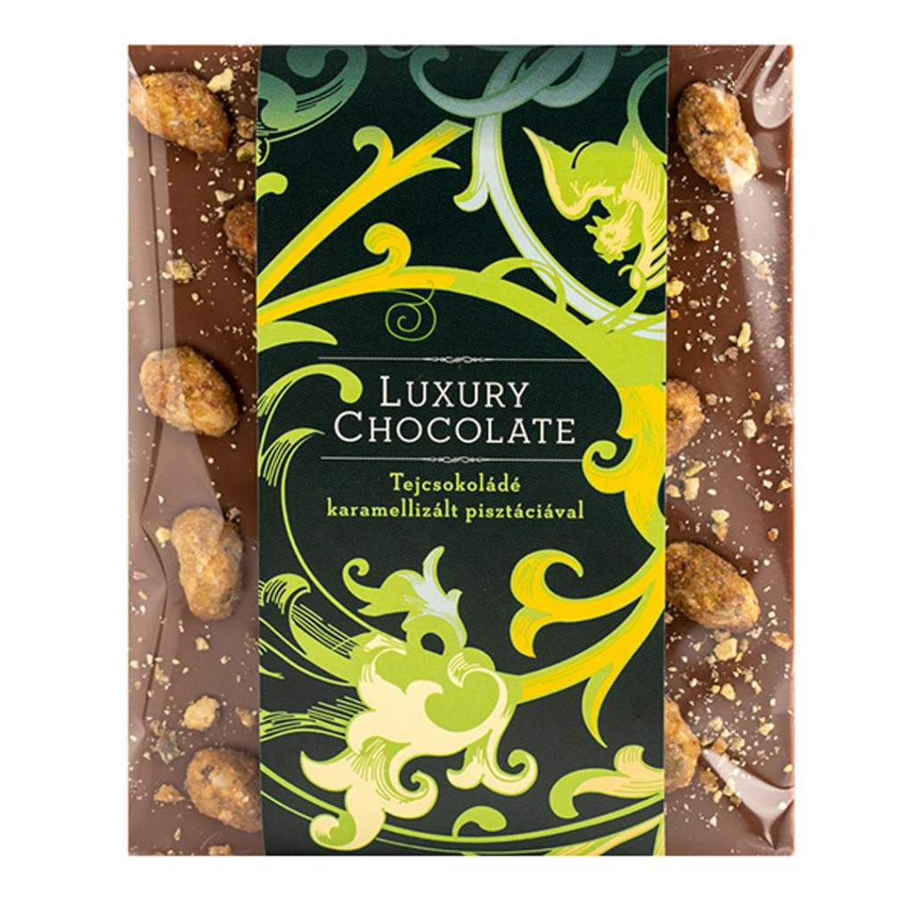 A tejcsokoládé kiválóan harmonizál a nem sózott, hanem karamellizált pisztáciával. Ropogós és finom.