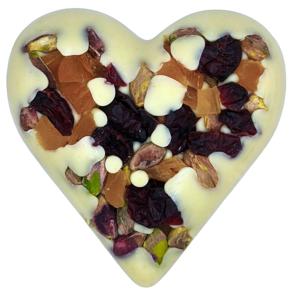 A selymes fehér csokoládéba öntött aszalt sárgabarack, vörösáfonya és pisztácia egyszerre kínál édes, gyümölcsös és enyhén sós ízeket. Ez a szív nemcsak szép, hanem minden falatban új élményt ad. Egy kiváló Valentin napi ajándék, amely meglep és emlékezetes marad.